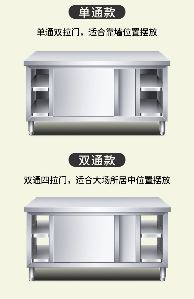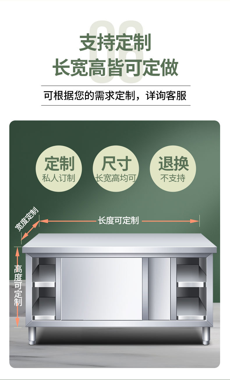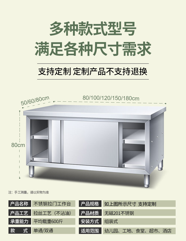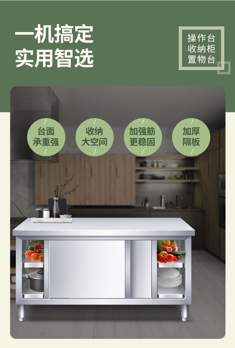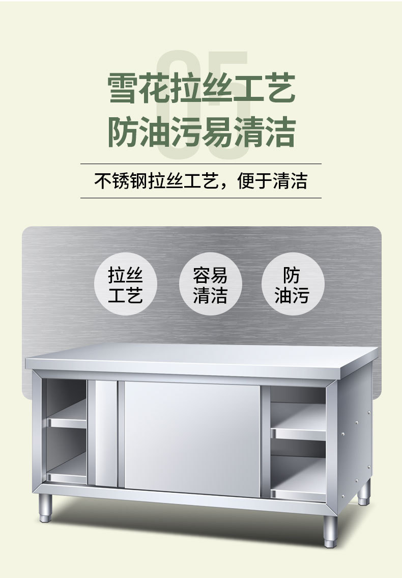 Stainless steel workbench kitchen countertop with sliding doors, chopping board storage cabinet, cutting table for commercial use in restaurants